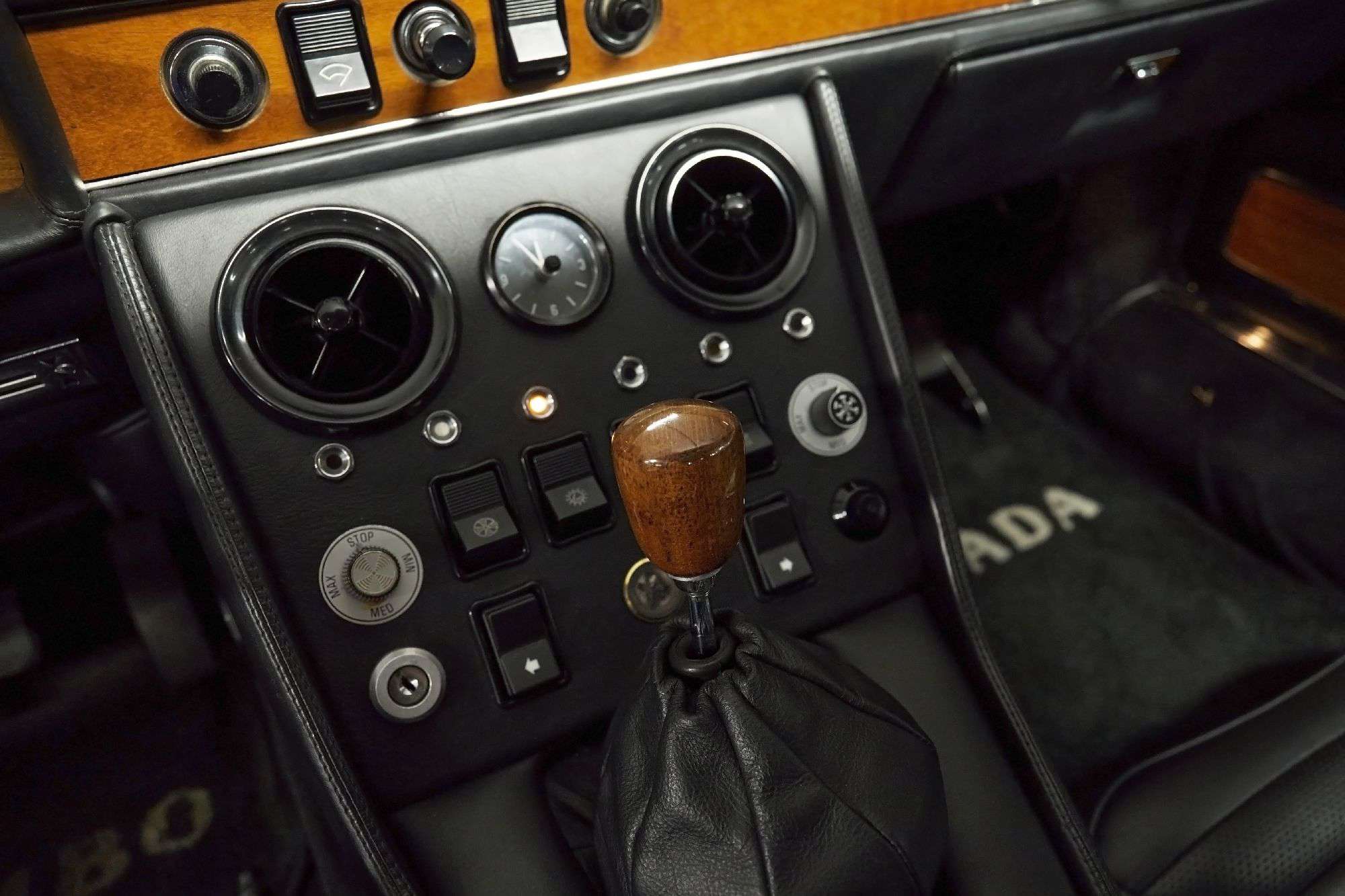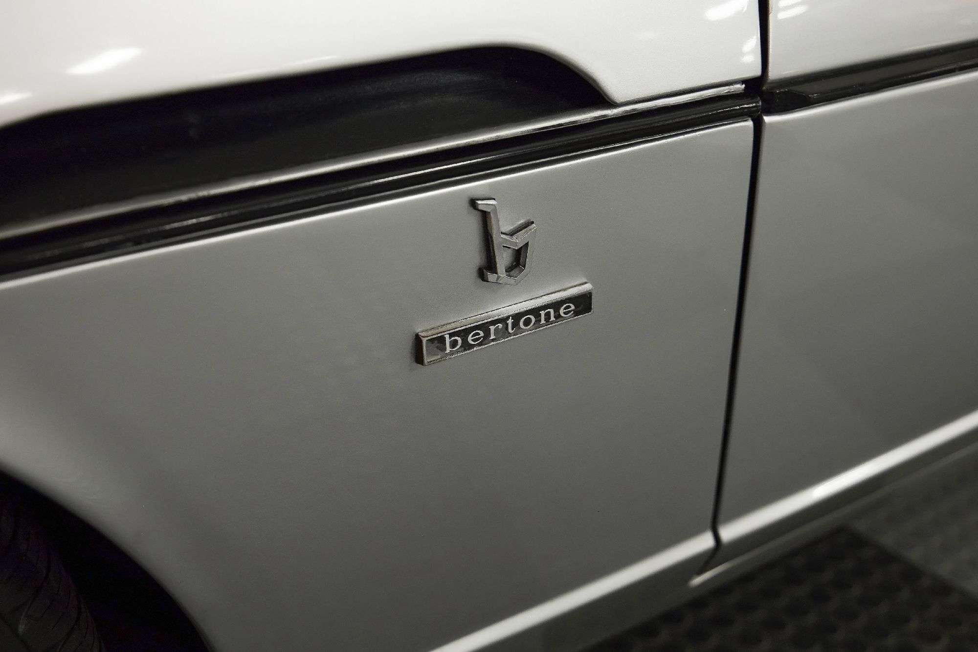Color-matching door panels and carpets are fitted, and features include woodgrain trim on the dashboard and door panels, air conditioning, power windows, a Voxson eight-track player, a Bertone dash badge, a front passenger footrest, a rear armrest, and black floor mats. Front three-point seat belts were installed under previous ownership along with a new brake light switch and a turn signal flasher. A replacement air conditioning compressor was also installed, and the system was converted to R134a refrigerant. The clock and radio do not work. The wood-rimmed steering wheel frames Jaeger instrumentation including a 190-mph speedometer, a 10k-rpm tachometer, an ammeter, and gauges for water temperature, oil pressure, oil temperature, and fuel level. The five-digit odometer shows 52k miles.