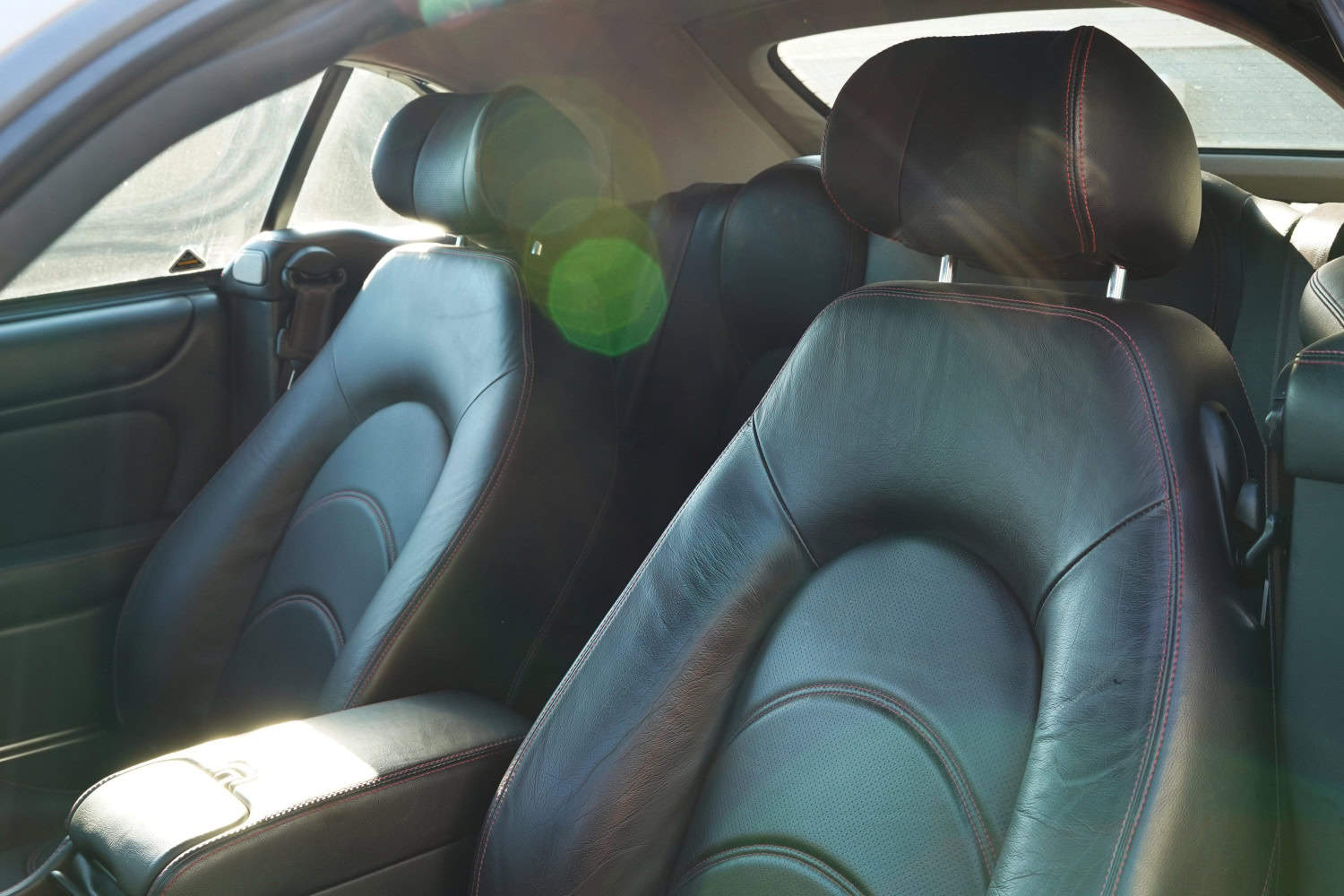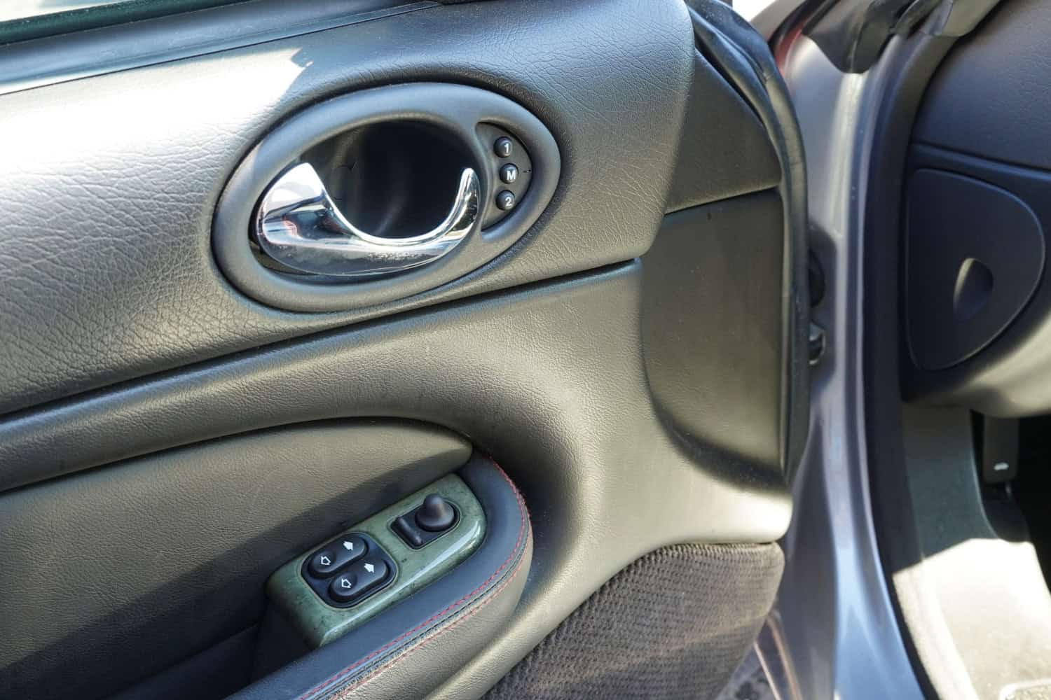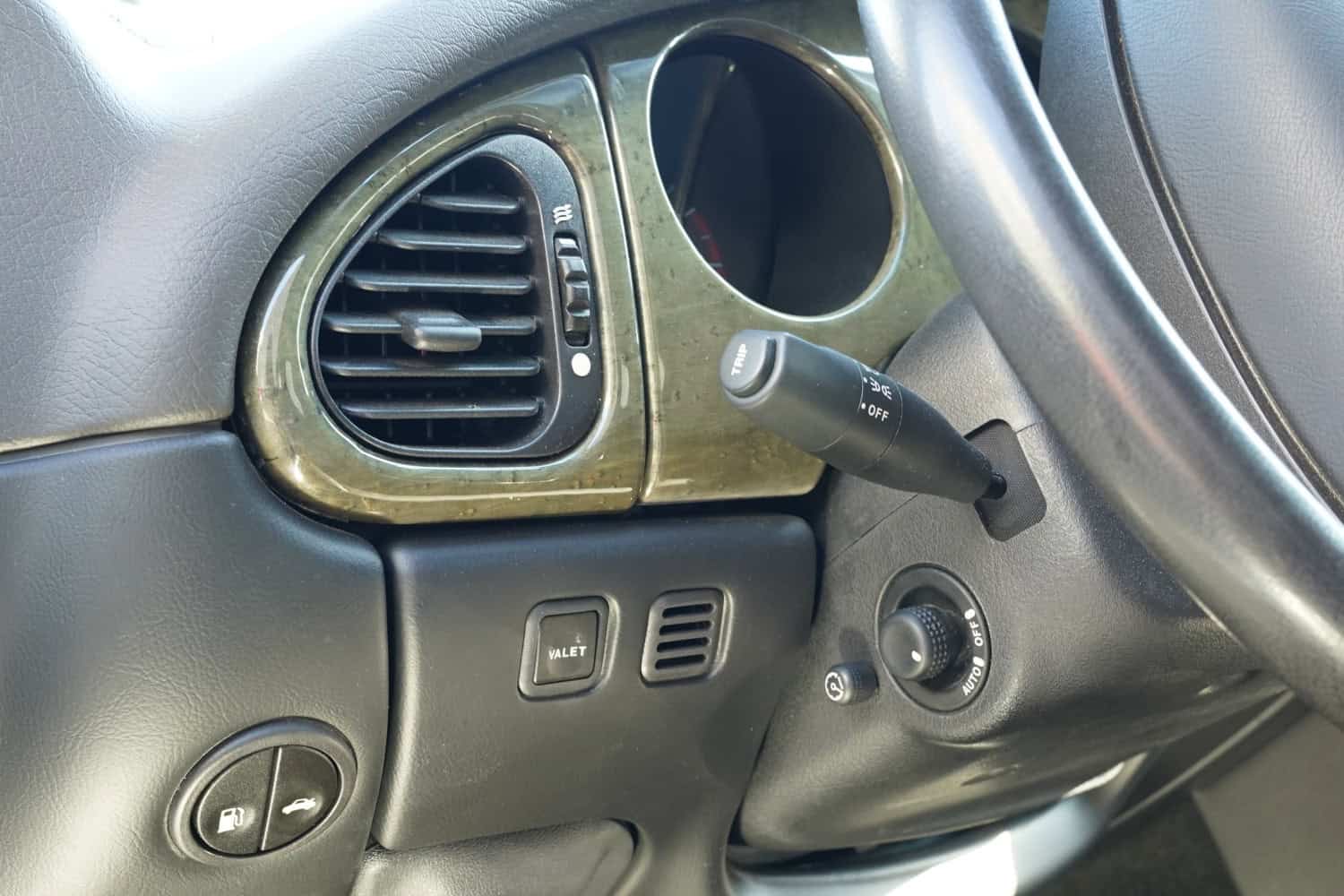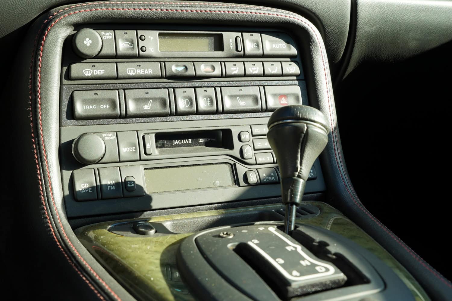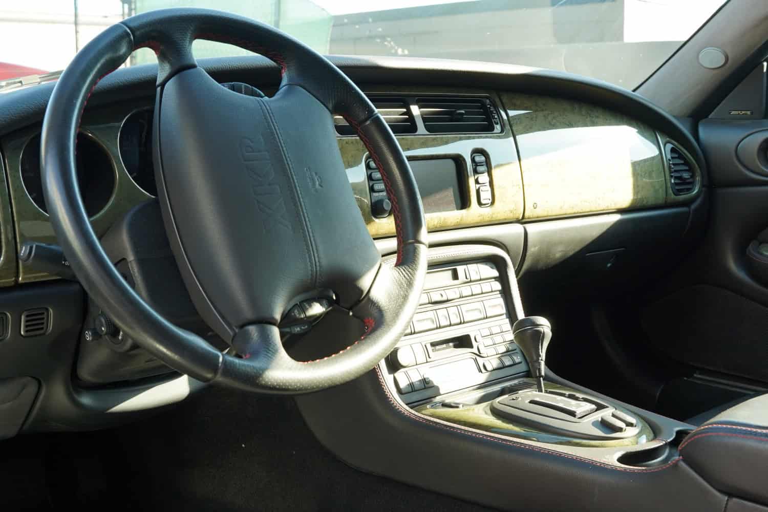 The heated power-adjustable front sport seats are upholstered in Warm Charcoal leather with contrasting red stitching, while gray-stained birdseye maple veneers accent the cabin. Additional appointments include automatic climate control, driver position memory, navigation, black rubber floor mats, Silverstone-branded door sill plates, a cassette stereo, a CD changer, and a 320-watt Alpine sound system. The multifunction steering wheel is mounted on a power-adjustable column and frames a 170-mph speedometer, a tachometer, and gauges for coolant temperature and fuel level. The digital odometer indicates 29k miles.