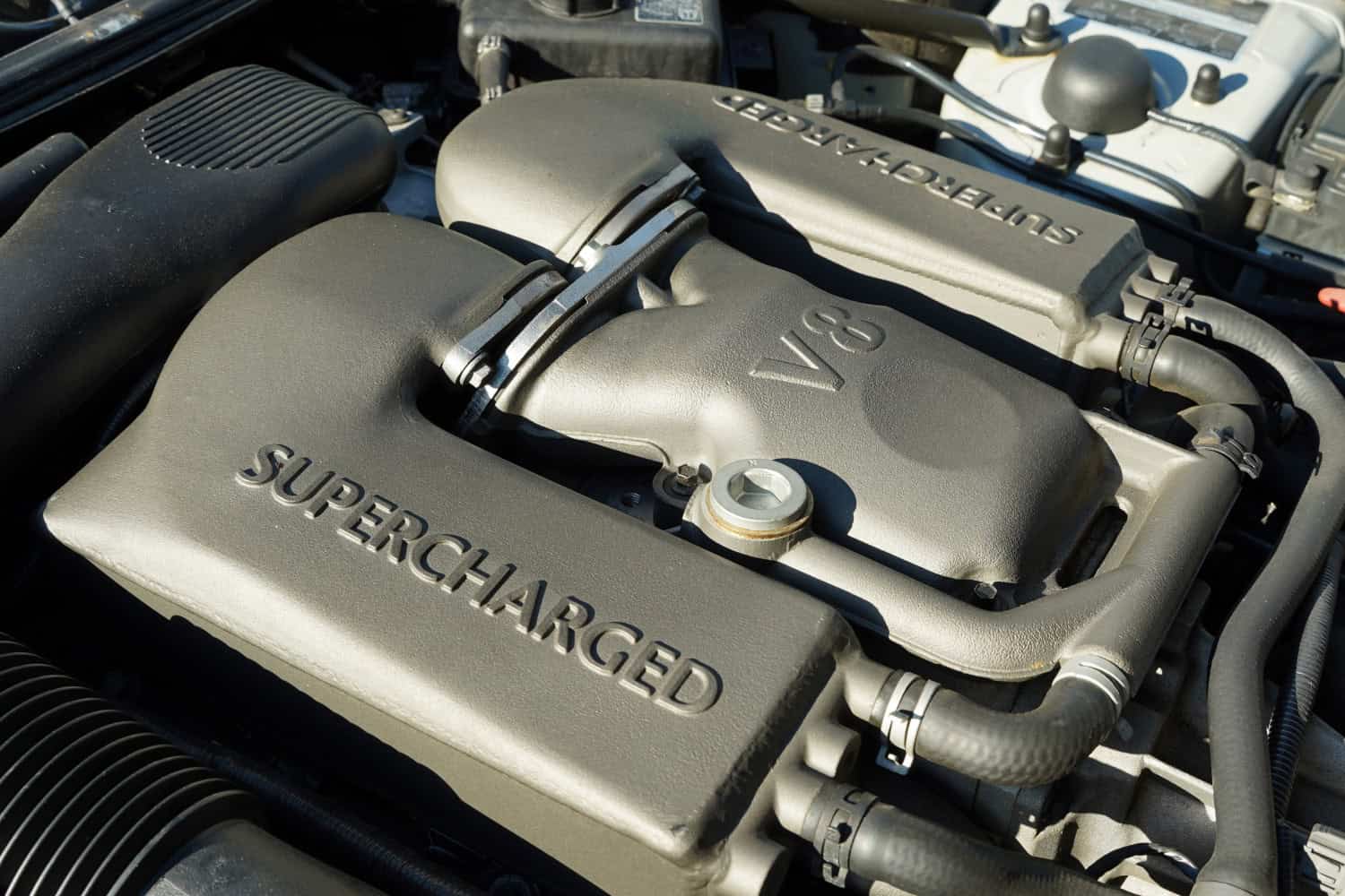 The supercharged 4.0-liter AJ V8 was factory rated at 370 horsepower and 387 lb-ft of torque. Power is routed to the rear wheels through a five-speed automatic transmission, Manufacturer’s literature is included in the sale along with spare brake pads.