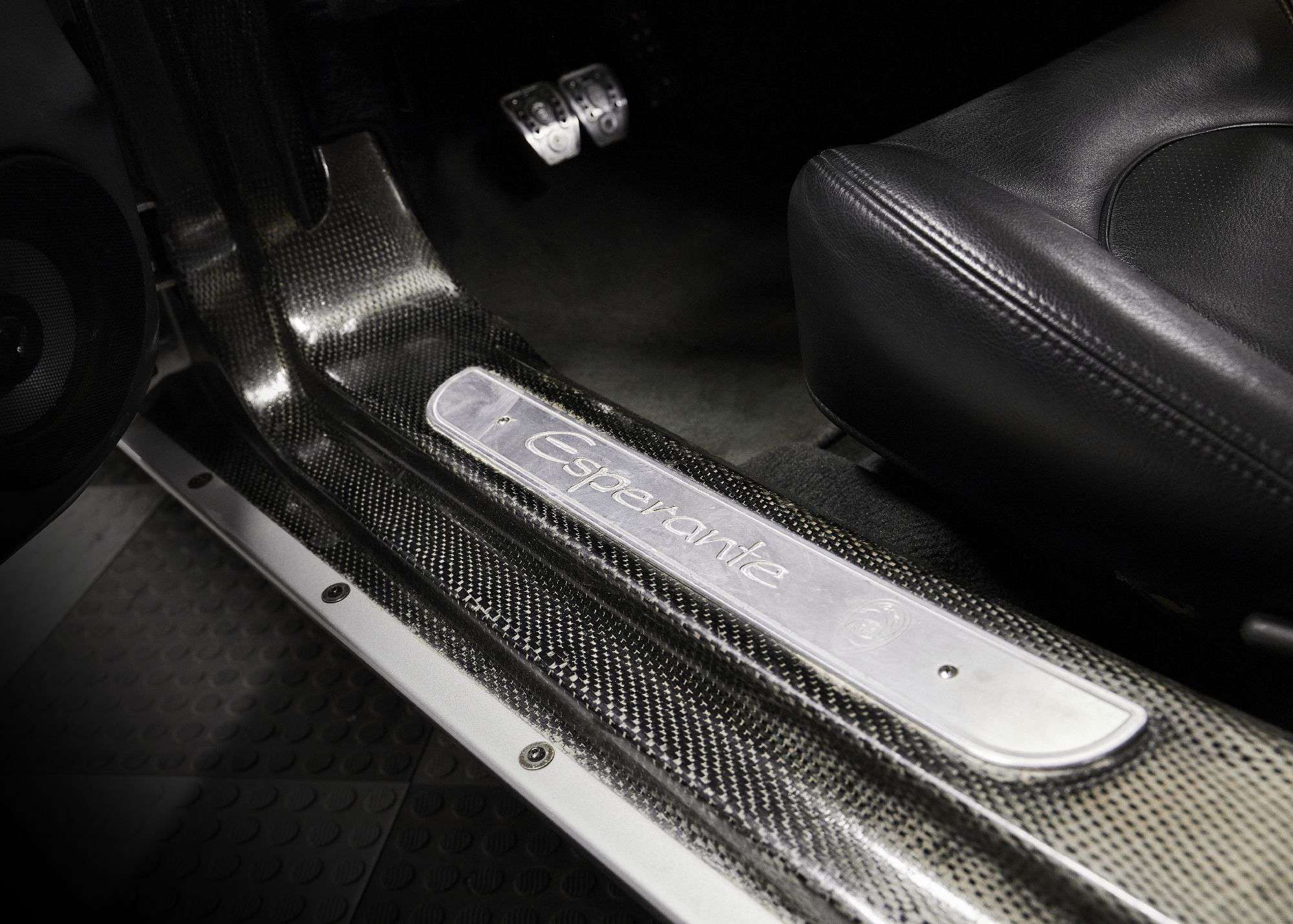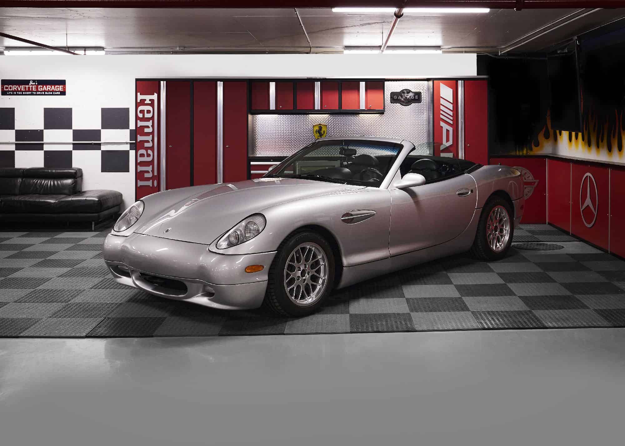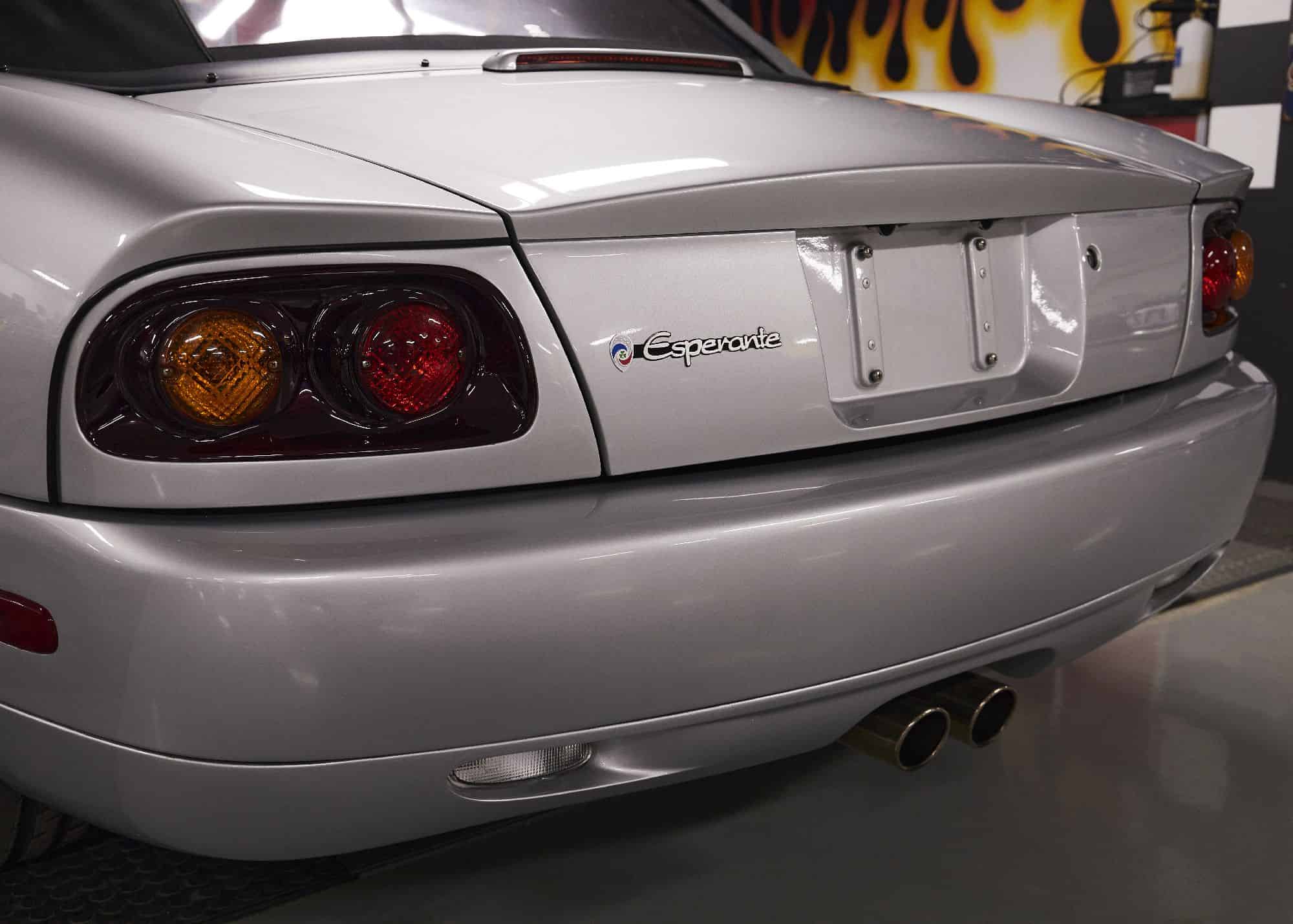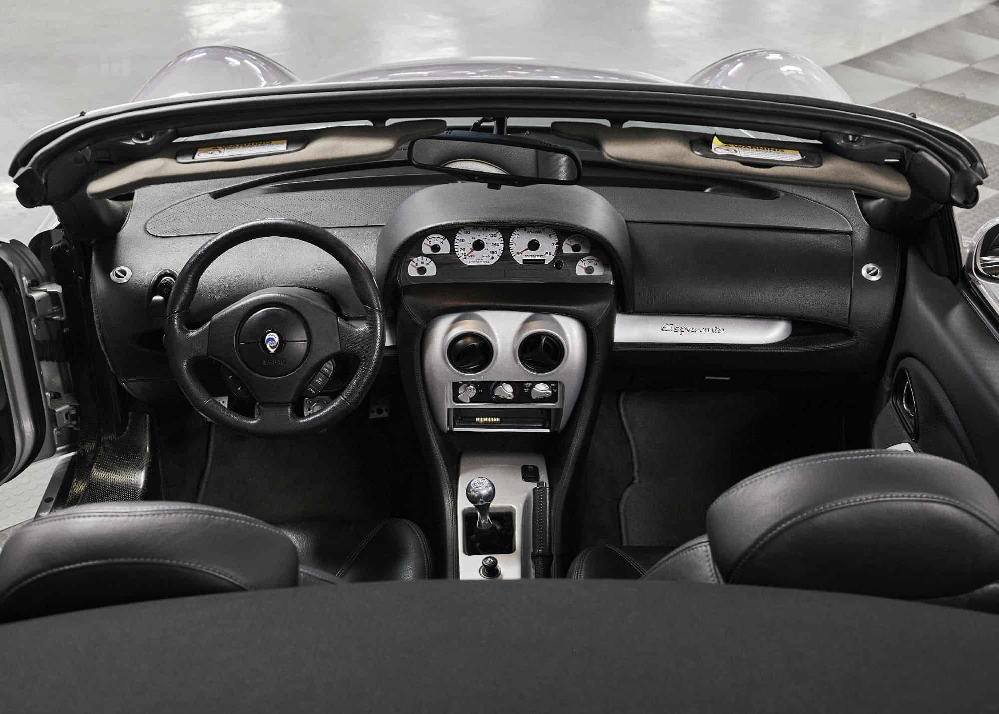 The Esperante’s body panels are constructed of superplastic-forming aluminum and mounted over a modular extruded-aluminum chassis with bonded and bolted steel subframes. This example is finished in silver metallic and is equipped with a power-retractable black soft top with a plastic rear window. Chrome-finished 17″ BBS RX wheels with Panoz-logo center caps are mounted with 255/45 Continental Extreme Contact DW tires. Stopping power is provided by four-wheel power-assisted disc brakes. A replacement Panoz-logo center cap is included in the sale.