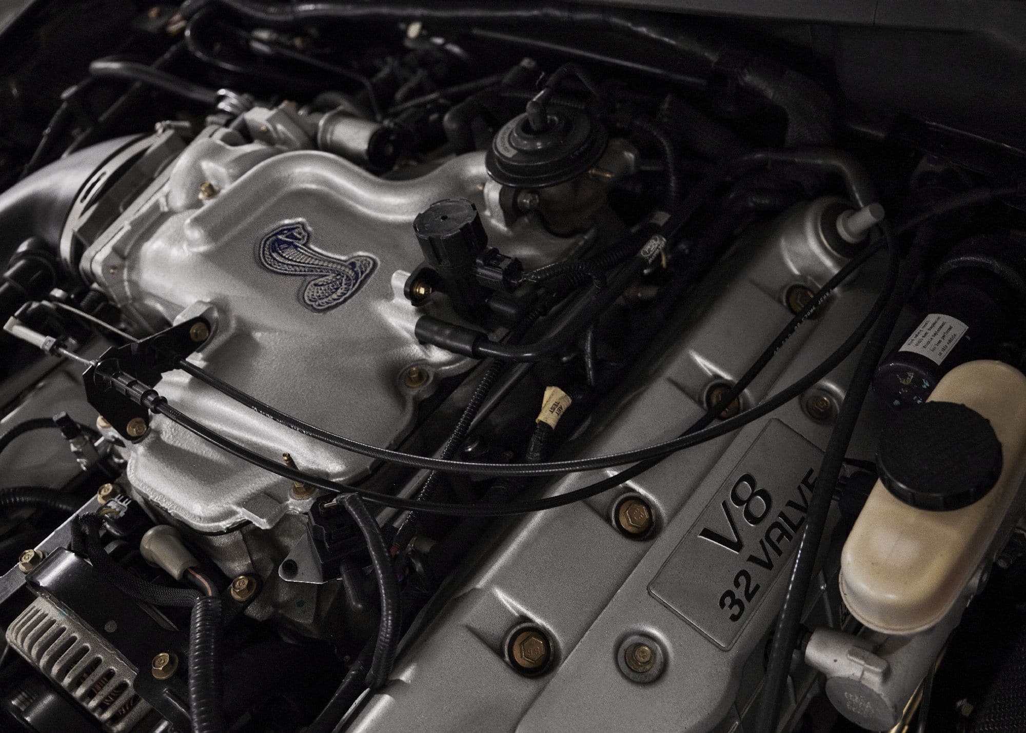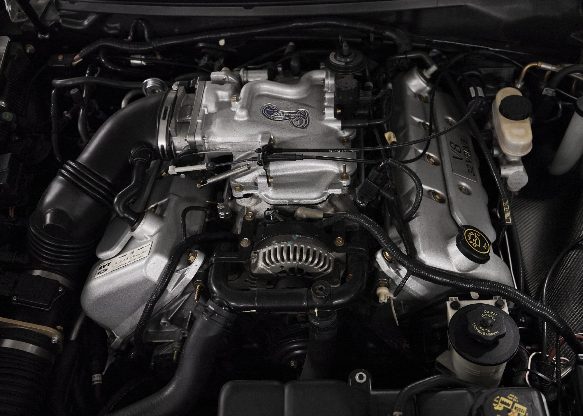 The Mustang SVT Cobra-derived engine is a 4.6L 32-valve all-aluminum V8 that was rated at 320 horsepower and 317 lb-ft of torque when new. An oil change was performed in July 2021. Power is sent to the rear wheels through a five-speed manual transmission and a limited-slip differential. The car features traction control and an independent rear suspension setup shared with the SVT Cobra.