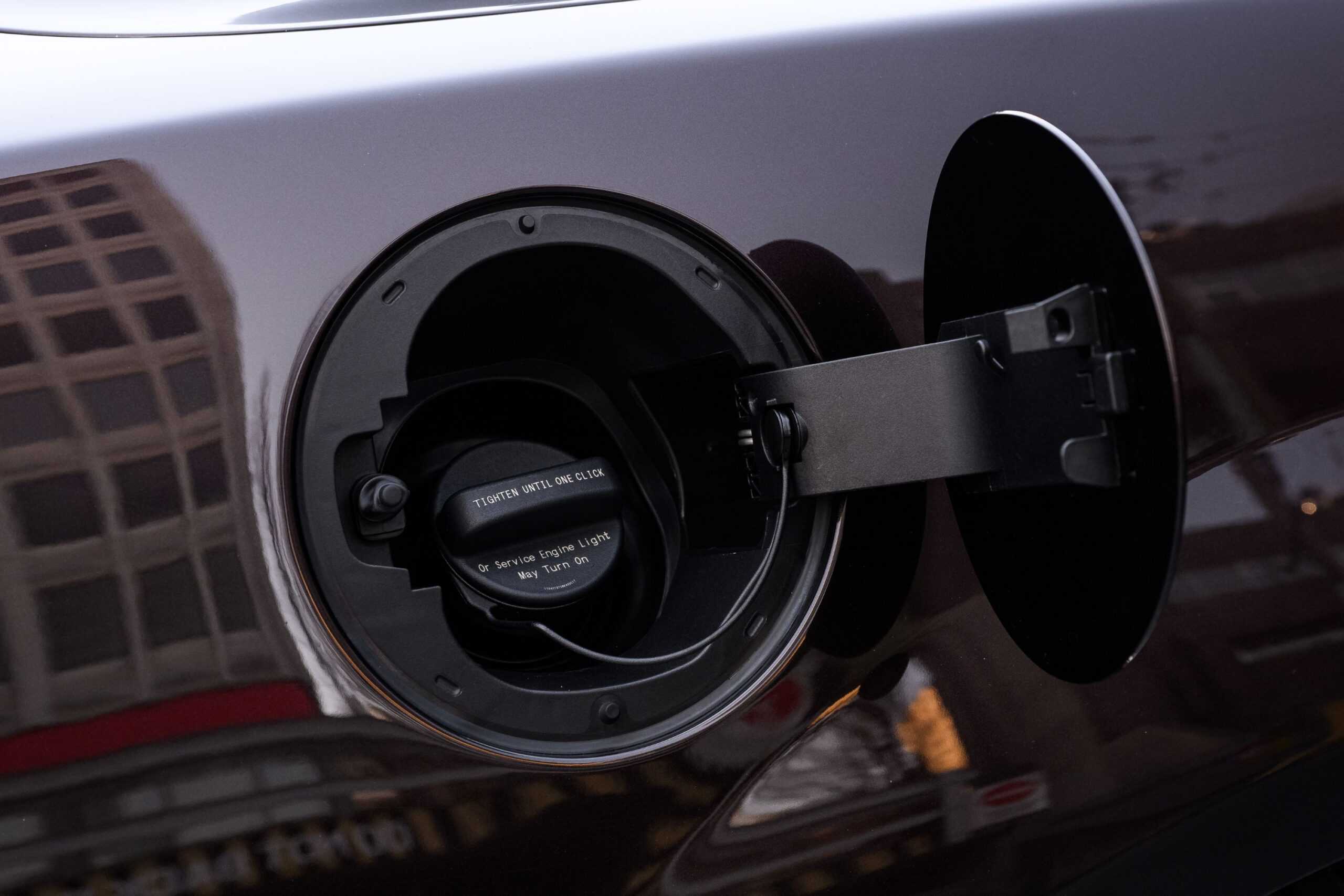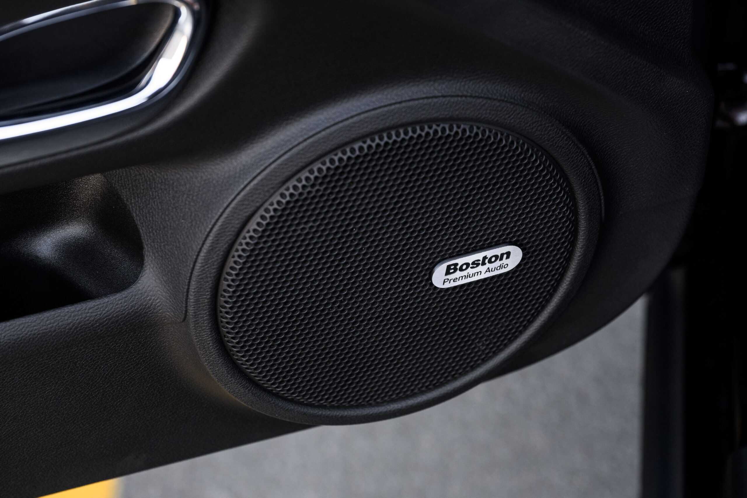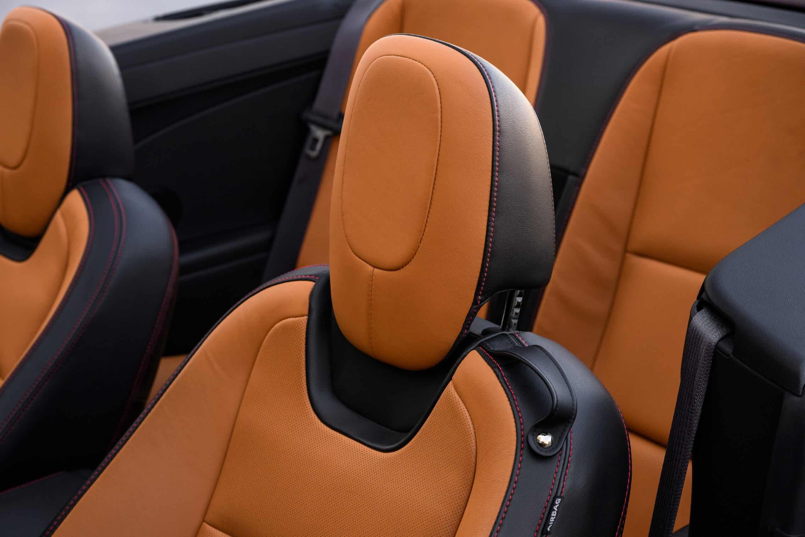 The seating surfaces are upholstered in two-tone black and amber leather that was exclusive to the Neiman Marcus edition while red stitching accents the seats, steering wheel, shifter, and center console. Amenities include heated and power-adjustable front seats, cruise control, keyless entry, remote start, a head-up display, and a Boston Acoustics Premium Audio system with Bluetooth. The leather-wrapped steering wheel frames a 185-mph speedometer, a 9k-rpm tachometer, and gauges for fuel level and coolant temperature. Additional gauges mounted in the center console display readings for oil temperature, oil pressure, transmission temperature, and voltage. The digital odometer indicates 10k km miles .