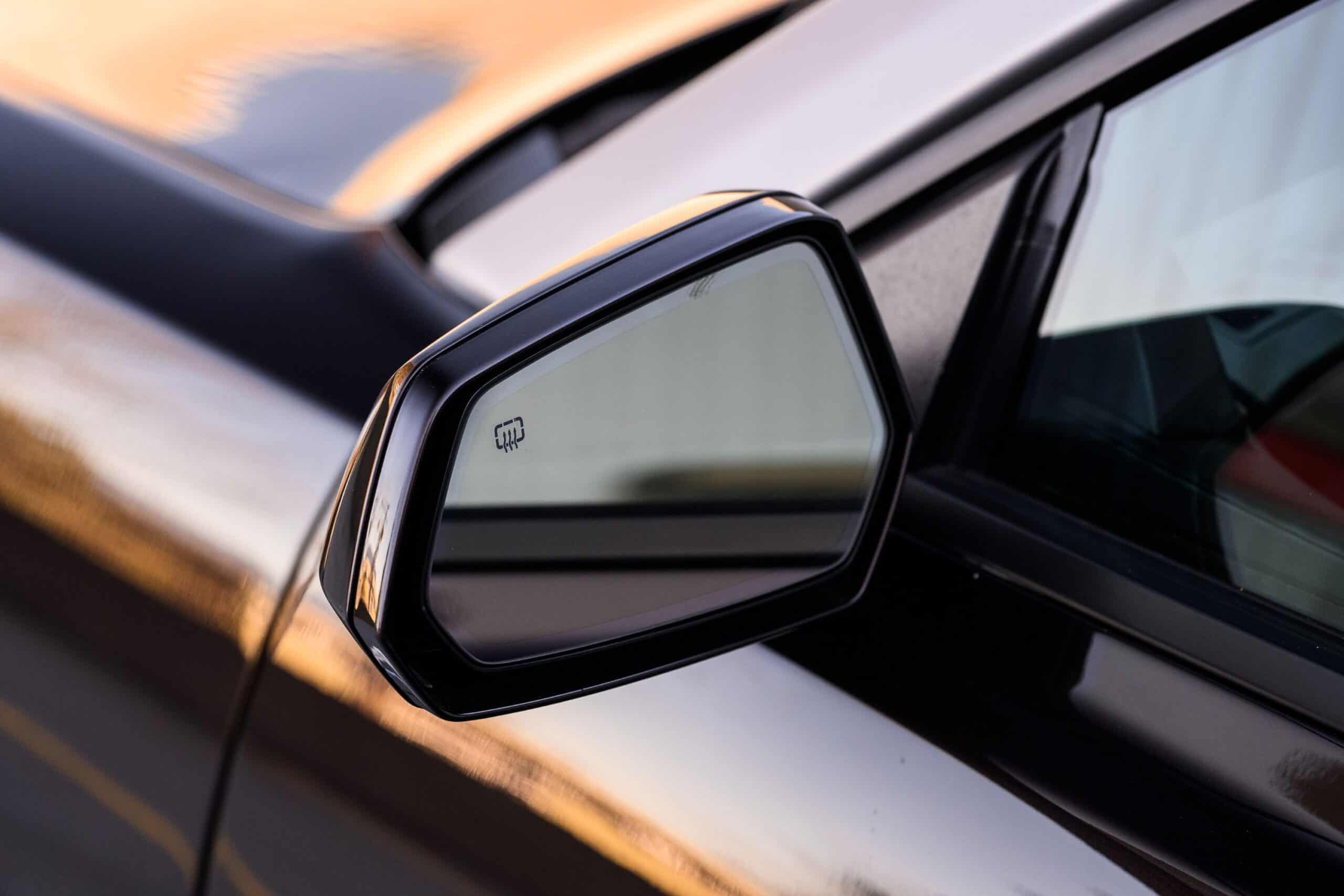 Additional equipment includes halo-ring HID headlights, fog lights, a body-color rear spoiler, a matte-silver windshield frame, chrome taillight bezels, and dual exhaust outlets. Silver-finished 21″ wheels feature a red accent stripe and are wrapped in Pirelli P Zero tires measuring 245/40 up front and 275/35 at the rear. Stopping power is provided by black Chevrolet-branded Brembo brake calipers over ventilated discs at all four corners.